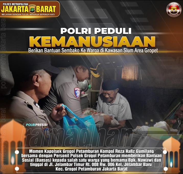 Jakarta Barat, DETEKSIJAYA.COM – Sebagai bentuk kepedulian terhadap sesama, terutama di bulan suci Ramadhan 1446 H, jajaran Personel Polsek Grogol Petamburan menggelar aksi sosial dengan menyalurkan bantuan paket sembako kepada warga kurang mampu di kawasan Slum Area Grogol Petamburan, Jakarta Barat.