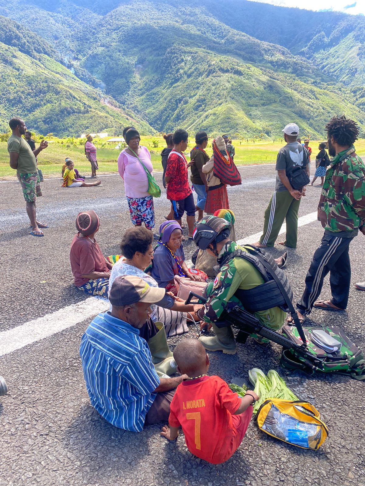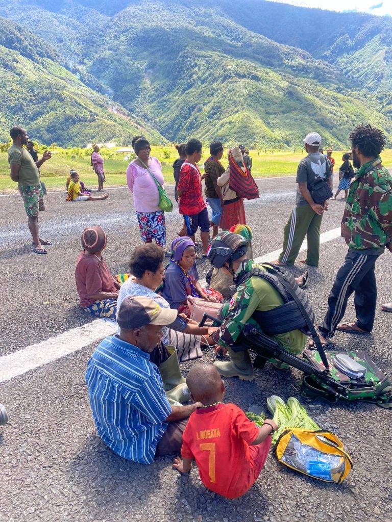 Pegunungan Bintang ~ Satgas Pamtas Statis Yonif 310/KK lakukan Komunikasi Sosial dengan warga untuk ciptakan rasa aman di Kp. Oknanggul Distrik Kiwirok Kab. Pegunungan Bintang, Papua Pegunungan, Jumat (11/8/2023)