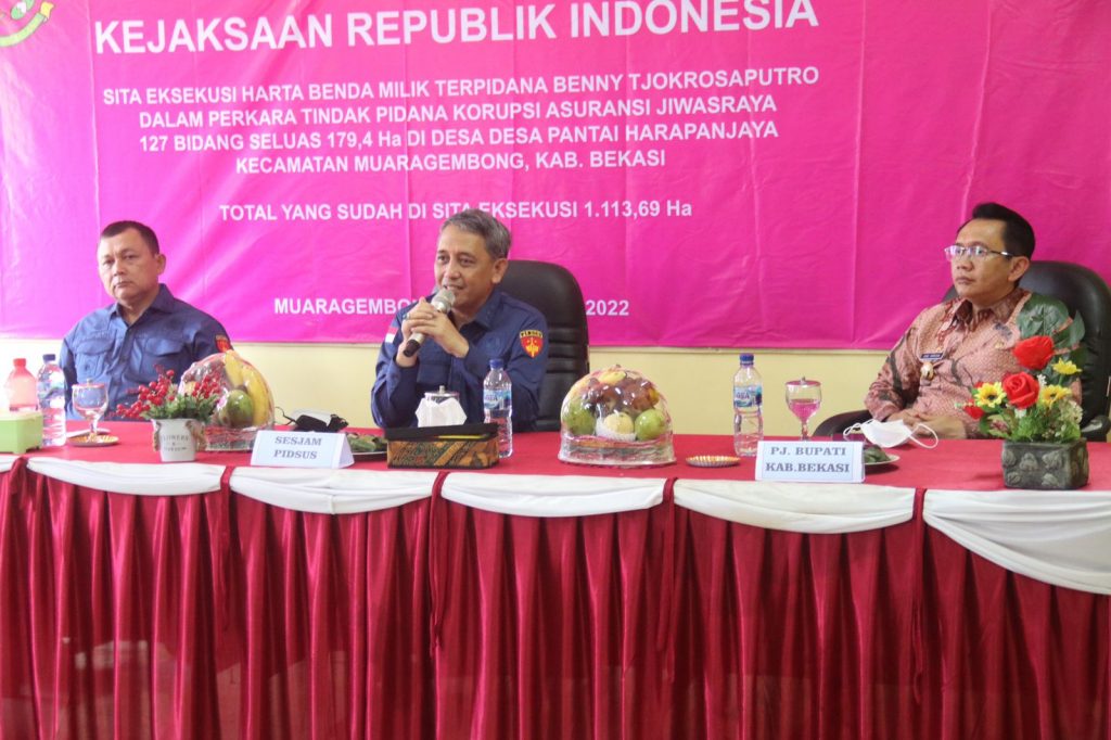 Sejak 01 Maret 2022 hingga 15 Desember 2022, telah dilakukan Sita eksekusi terhadap aset yang terafiliasi dengan Terpidana Benny Tjokrosaputro, sejumlah 1.786 bidang tanah dengan luas keseluruhan 11.136.918 M2 (1113,69 HA) yang terletak diantaranya yaitu Kabupaten Bekasi, Kabupaten Purwakarta, Kabupaten Tangerang, Kabupaten Serang, Kabupaten Bogor, dan Kabupaten Lebak.