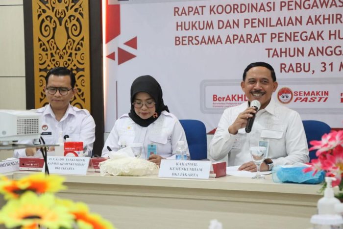 DETEKSIJAYA.COM – Kepala Kantor Wilayah Kementerian Hukum dan HAM DKI Jakarta Ibnu Chuldun, memimpin pelaksanaan rapat koordinasi pengawasan pelaksanaan bantuan hukum dan penilaian akhir kelurahan sadar hukum bersama aparat penegak hukum (APH) Provinsi DKI Jakarta, di Lapas Kelas IIA Salemba, pada Rabu (31/5/23).