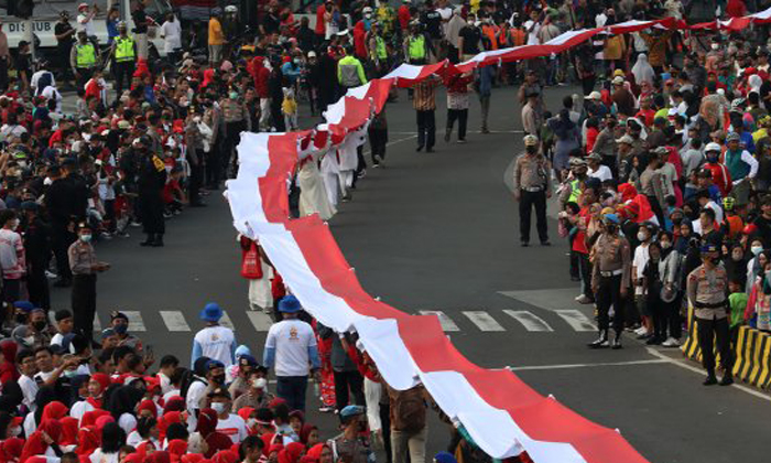 “Jadi hari ini kita bersama-sama dengan seluruh elemen bangsa baik dari instansi pemerintahan, kemahasiswaan, dan ormas-ormas, total hari ini yang ikut bergabung kurang lebih 50 ribu orang. Dimana kegiatan Kirab Merah Putih ini masih bagian dari rangkaian kegiatan perayaan hari ulang tahun Kemerdekaan,” terang Kapolri.