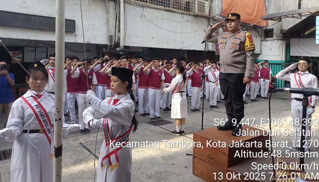 Jakarta Barat, DETEKSIJAYA.COM – Kapolsek Tambora, Kompol Muhammad Kukuh Islami, S.I.K., M.I.K., melaksanakan kegiatan “Police Goes To School” dengan menjadi Pembina Upacara Bendera di SMK Permata Bunda, Yayasan Widuri Indah Permata Bunda, pada Senin (13/10/2025).