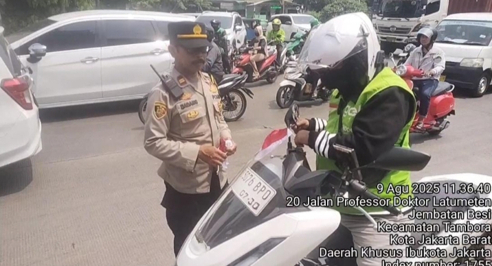 Pada Sabtu (9/8/2025), Kapolsubsektor Jembatan Besi, Polsek Tambora, Iptu Dadang Daryana, melaksanakan kegiatan pembagian 30 bendera Merah Putih kepada pengendara dan warga yang melintas di Jalan Prof. DR. Latumenten, Kelurahan Jembatan Besi.