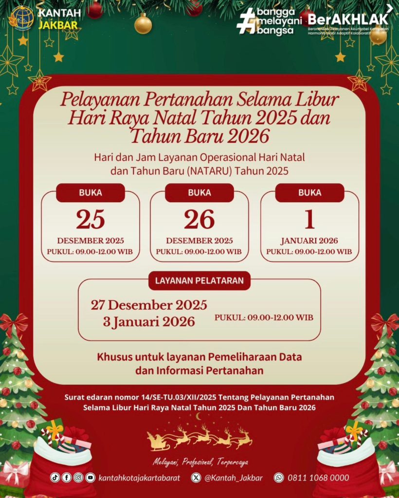 Kita mengikuti sesuai dengan surat edaran Nomor 14/SE.TU.03/XII/2025 tentang Pelayanan Pertanahan Selama Libur Hari Raya Natal Tahun 2025 dan Tahun Baru 2016, ujarnya.