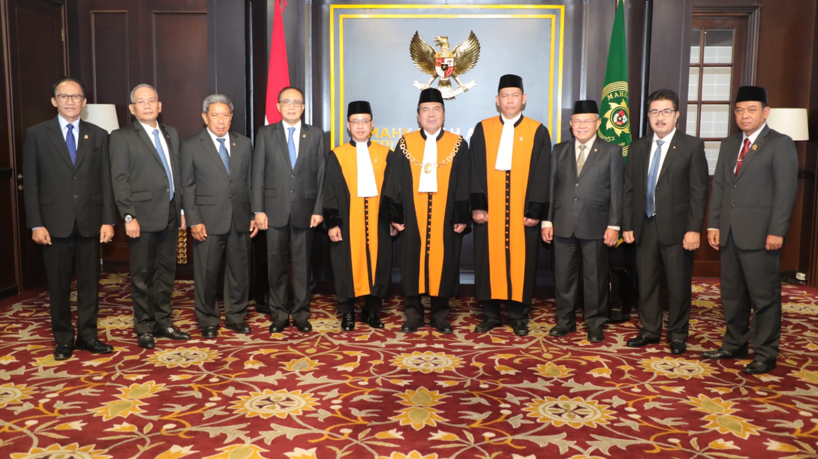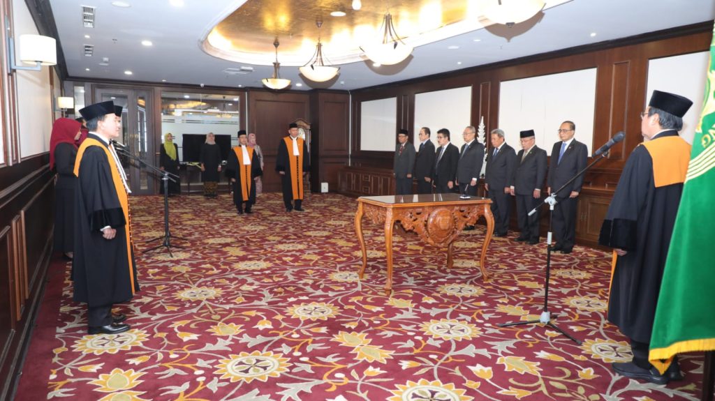 DETEKSIJAYA.COM – Ketua Mahkamah Agung Prof. Dr. H. M. Syarifuddin, SH, MH memandu sumpah jabatan Dr. Sugeng Santoso PN, MM, MH dan Dr. Junaedi, SH, SE, MSi sebagai Hakim Ad Hoc Pengadilan Hubungan Industrial (PHI) Mahkamah Agung RI pada Selasa, 8 Agustus 2023 di lantai 13 Gedung Mahkamah Agung (MA).