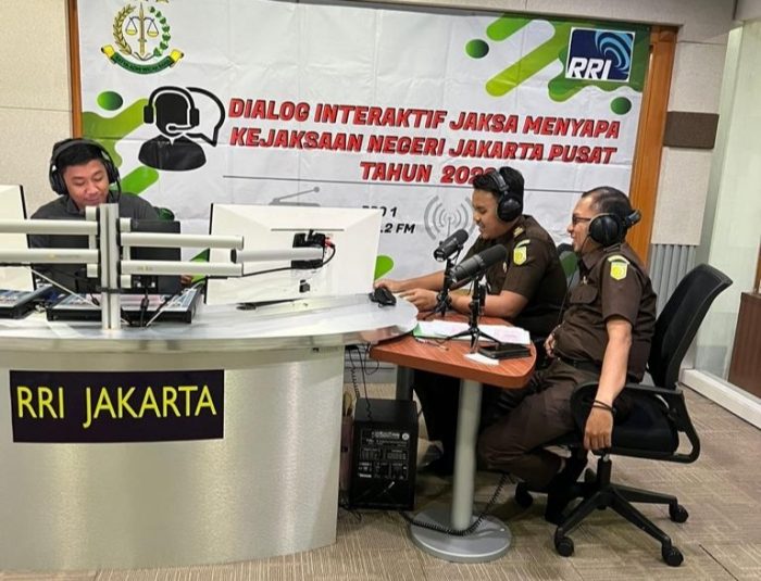 JAKARTA I DETEKSIJAYA.COM – Dalam rangka melaksanakan kegiatan Dialog Interaktif Jaksa Menyapa, Kejari Jakpus lakukan kerjasama dengan Lembaga Penyiaran Radio Republik Indonesia (RRI) Pro 1 91.2 FM Jakarta, berlokasi di Kantor Radio Republik Indonesia, Jl. Medan Merdeka Barat, Gambir, Jakarta Pusat.