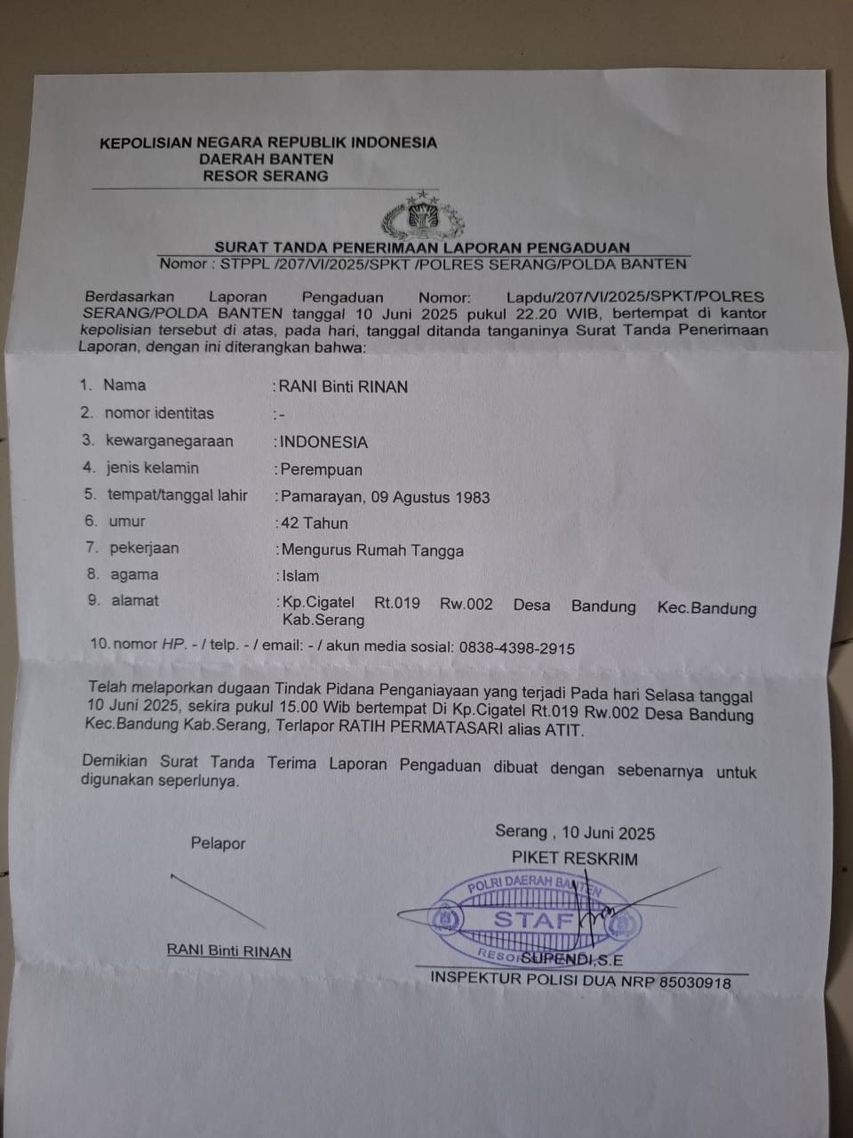 Pasalnya,Laporan korban sebagaimana tertuang dalam Surat Laporan Pengaduan Nomor : Lapdu/207/VI/2025/SPKT/POLRES SERANG/POLDA BANTEN Tanggal 10 Juni 2025.