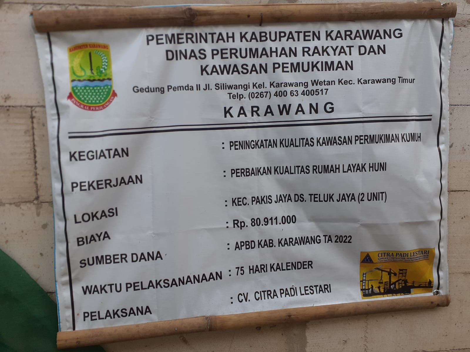 Pembangunan tersebut merupakan program dari Dinas Perumahan Rakyat Dan Kawasan Pemukiman Kabupaten Karawang untuk masyarakat berpenghasilan rendah yang menempati tempat tinggal tidak layak huni, dengan tujuan agar masyarakat dapat tinggal di rumah layak yang memberikan kenyaman dan meningkatkan kesejahteraan masyarakat