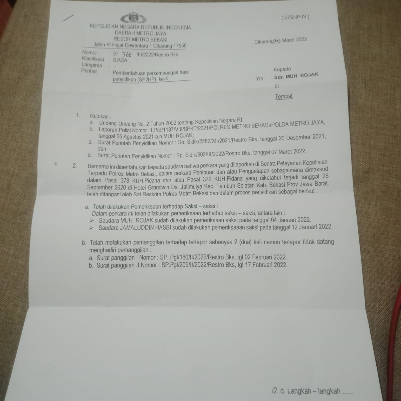 Selama proses pemerikasaan kurang lebih hampir 7 bulan di Unit 5 Ranmor Polres Metro Kabupaten Bekasi perkaranya sudah masuk ditahap penyidikan sejak tanggal 23 Desember 2021, pemanggilan hingga dua kali terhadap pelaku sudah dilakukan oleh