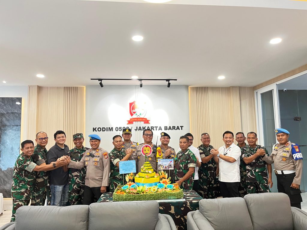 Dengan membawa kue ulang tahun dan Nasi Tumpeng, rombongan Polres Jakbar disambut hangat oleh jajaran TNI Kodim 0503 JB.