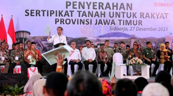 Demikian disampaikan Presiden Jokowi dalam acara penyerahan sertifikat tanah untuk rakyat yang digelar di Gelanggang Olah Raga (GOR) Delta, Kabupaten Sidoarjo, Provinsi Jawa Timur, pada Rabu, 27 Desember 2023.