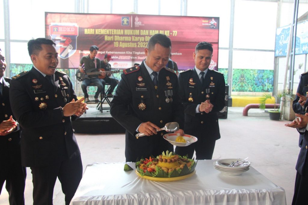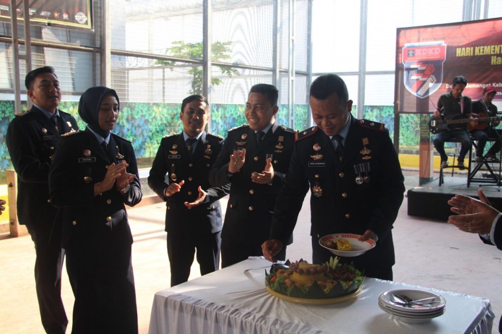 Kepala Rutan Kelas I Depok, Andi Gunawan beserta Pejabat Struktural dan Pegawai melakukan Pemotongan Tumpeng ini selain sebagai rangkaian dari Kegiatan HDKD, kegiatan ini pun menjadi bentuk doa dan harapan agar seluruh Insan Pengayoman terus berusaha meningkatan kinerja demi mewujudkan Kementerian Hukum dan HAM yang lebih baik mengabdi untuk Bangsa dan Negara.