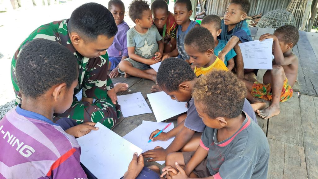 PEGUNUNGAN BINTANG ~ Sebagai bentuk kepedulian dalam mencerdaskan anak bangsa, Yonif 310/KK mengajak anak anak pedalaman Papua untuk belajar membaca dan berhitung sekaligus mengajarkan hidup sehat, Sabtu (19/08/2023)