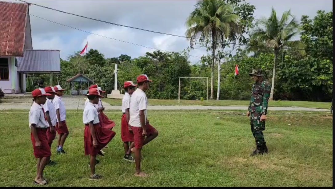 Dalam menyambut upacara peringatan Kemerdekaan Indonesia yang ke-78, Satgas Yonif 310/KK Pamtas RI-Papua, Pos Yabanda melatih dan mengajarkan Pelatihan Baris Berbaris (PBB) untuk pasukan pengibar bendera kepada siswa yang dilaksanakan di Lapangan SD Inpres Yabanda, Distrik Yaffi, Kabupaten Keerom, Papua, Kamis (10/8/2023).