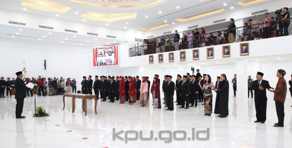 Turut hadir Anggota Bawaslu Totok Hariyono, Deputi Bidang Dukungan Teknis KPU, selaku Plh Sekjen KPU Eberta Kawima, serta sekretaris KPU provinsi dan KPU kab/kota yang dilantik. (humas kpu )